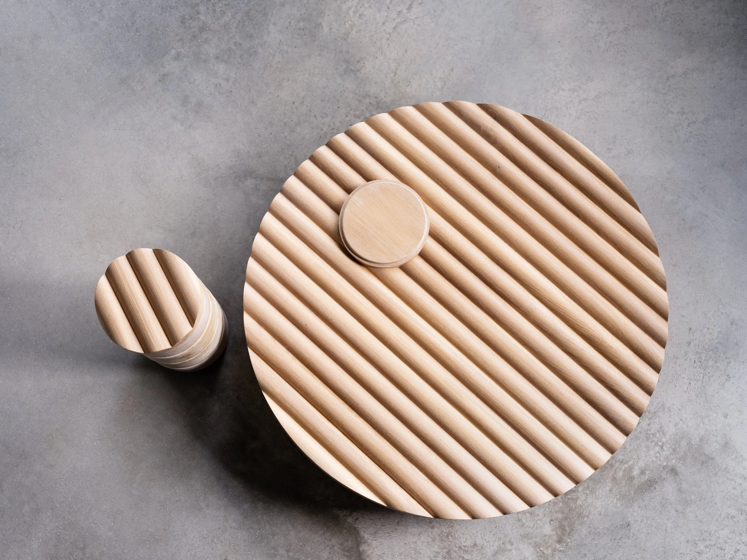 Out of this residency, EBBA produced Stack - a coffee table which utilises stacking ceramic forms to create a flexible design centred around a ribbed oak table surface. This machined surface playfully references the architectural facades of EBBA’s work whilst creating a bold surface for interlocking trays to slide across the tabletop.