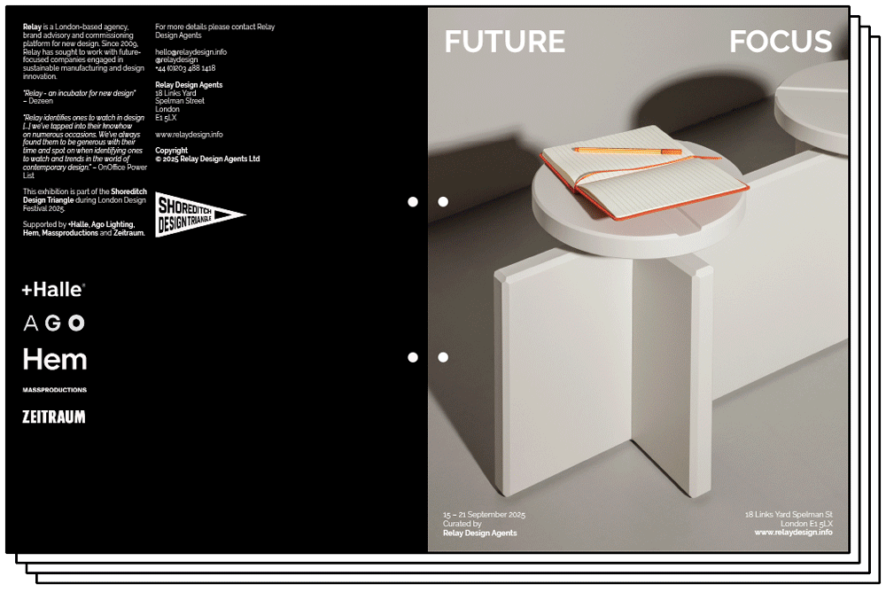 This exhibition is part of the Shoreditch Design Triangle 2025. Supported by +Halle, Ago Lighting, Hem, Massproductions and Zeitraum.